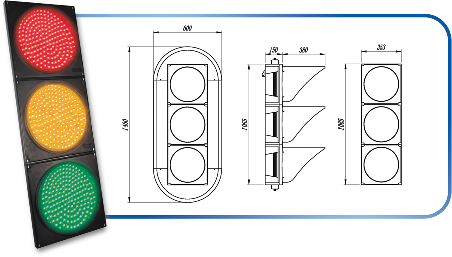 鼎光 JD300-3-DA LED滿屏機(jī)動(dòng)車信號(hào)燈采用LED發(fā)光方式,符合國(guó)標(biāo)《道路交通信號(hào)燈》(GB14887-2011)的要求, 并且通過(guò)了公安部交通安全產(chǎn)品質(zhì)量監(jiān)督檢測(cè)中心的檢測(cè)。交叉口信號(hào)燈按車道功能設(shè)置,每組信號(hào)燈為具有可顯示紅、黃、 綠三色箭頭燈和全屏燈功能的燈具,安裝附于車道下游的懸臂桿或立柱式燈桿上,燈桿基礎(chǔ)必須安裝地線,接地電阻小于或等 于10歐姆。